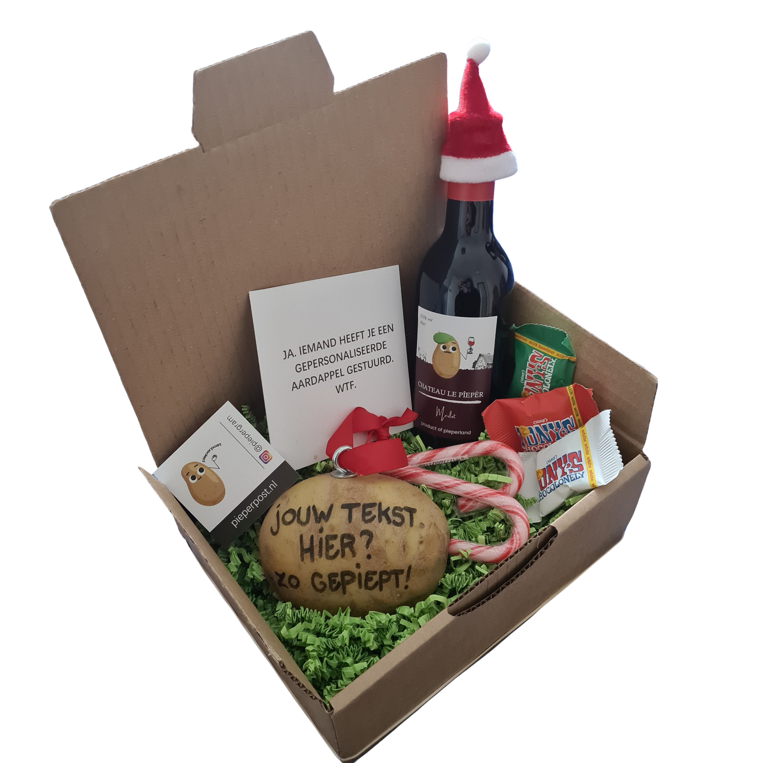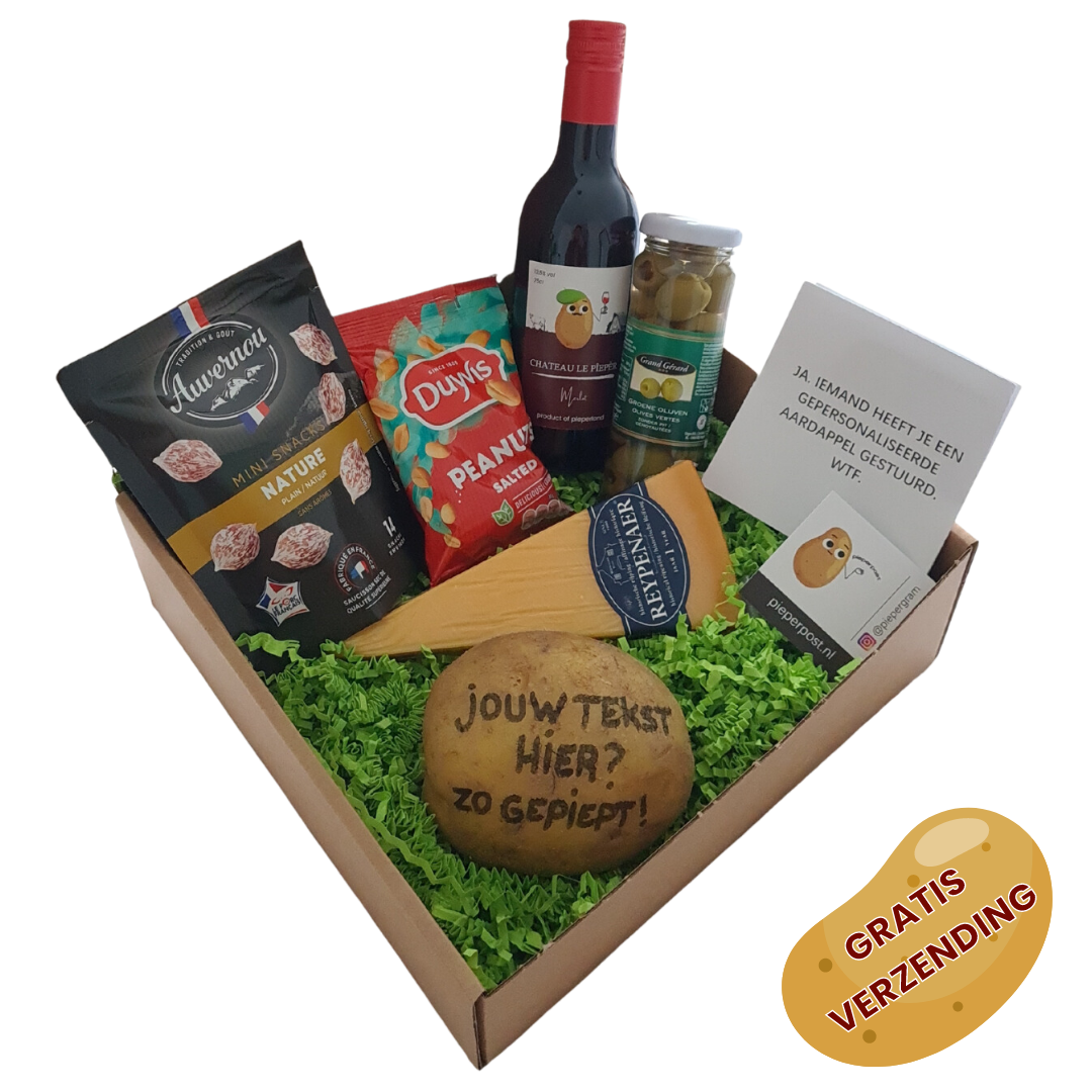Voor bedrijven kunnen we volledig maatwerk leveren. Je bepaalt als bedrijf helemaal zelf de inhoud van je relatiegeschenken. Zowel de tekst op de aardappel als de items in het pakket kunnen in overleg gekozen worden. Hierbij bieden wij ruime keuze uit heerlijke drankjes zoals pieperbier, leuke pieper-merchandise zoals onze piepersokken, en lekkere snacks zoals onze heerlijke kaasjes.